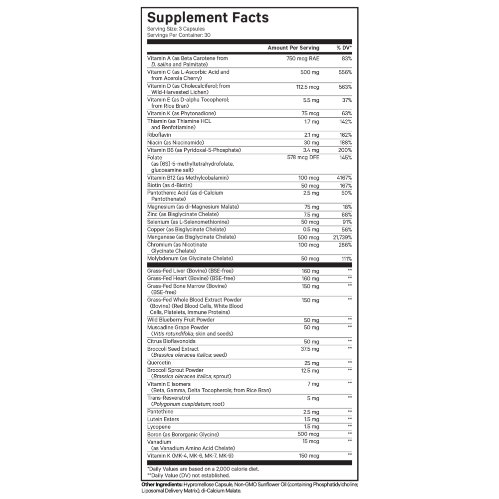 • Designed for both men and women, this multivitamin is enriched with Grass-Fed Liver, Heart, and Bone Marrow extracts source from BSE-free bovine. These premium ingredients enhance the formula and help provide a robust nutritional profile.