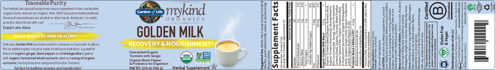 mykind Organics Golden Milk—and the entire line of Herbals—is Certified USDA Organic and Non-GMO Project Verified ensuring these herbals are clean and grown without toxic pesticides, herbicides or fungicides. Garden of Life also use an Organic, Non-GMO Verified extraction method so no harsh chemicals or conventional corn alcohol are used. Real to the Root—mykind Organics Herbal Supplements.