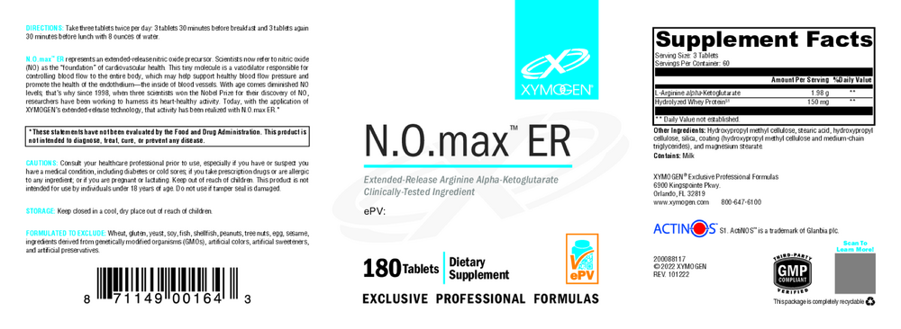 N.O.max™ ER represents an extended-release nitric oxide precursor. Scientists now refer to nitric oxide (NO) as the “foundation” of cardiovascular health. This tiny molecule is a vasodilator responsible for controlling blood flow to the entire body, which may help support healthy blood flow pressure and promote the health of the endothelium—the inside of blood vessels. With age comes diminished NO levels; that’s why since 1998, when three scientists won the Nobel Prize for their discovery of NO, researchers have been working to harness its heart-healthy activity. Today, with the application of XYMOGEN’s extended-release technology, that activity has been realized with N.O.max ER.*