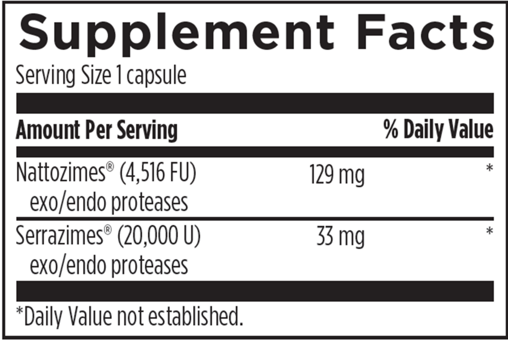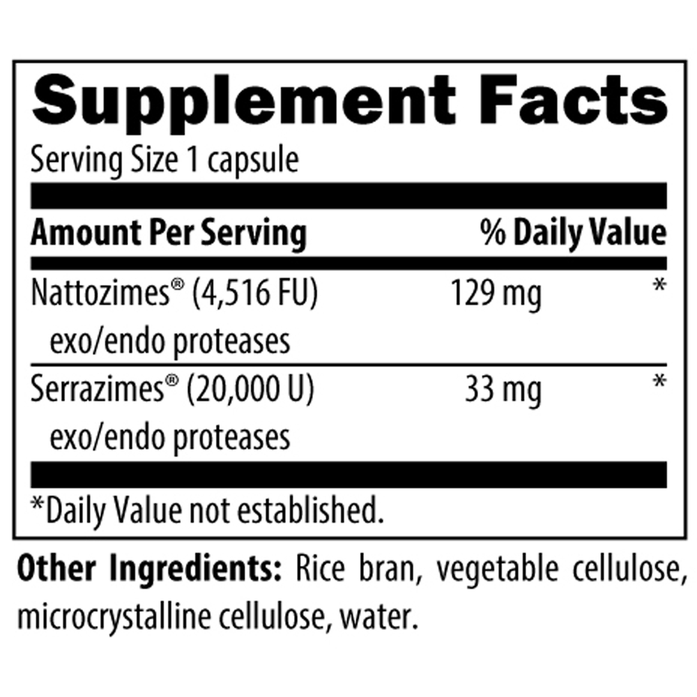 Natto-Serrazime™ is a blend of two very potent proteolytic enzymes, Nattozimes® and Serrazimes®. In various studies, these brand name enzyme products have been shown to have the same thrombolytic and fibrinolytic activities as the popular enzyme products nattokinase and serrapeptidase, and can support joint, circulatory, respiratory and immune health.*