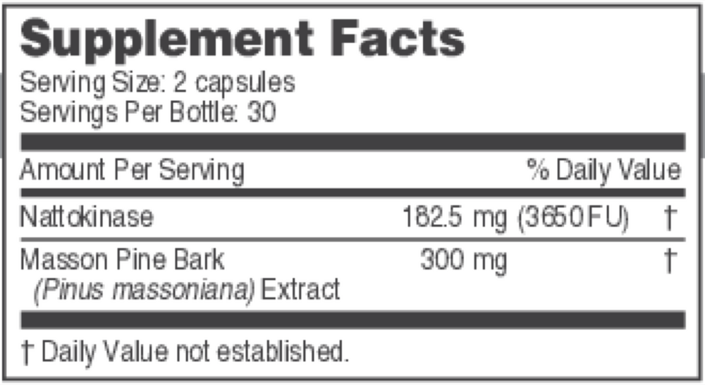 •.Supports healthy blood pressure•.Promotes healthy circulation•.Supports healthy blood clotting•.Promotes heart and blood vessel healthcontains the highest dose combination of nattokinase and a pine bark extract to support heart, blood pressure and blood vessel health by promoting healthy blood flow, circulation and healthy blood clotting. NattoPine provides 3650 fibrinolytic units (182.5 mg) nattokinase and 300 mg pine bark extract per serving.enhances the production of plasmin and urokinase, two clot-dissolving enzymes. Nattokinase increases tissue plasminogen activator (tPA), a protein that activates plasmin so it can do its job of supporting healthy blood clotting and circulation.Pine bark extract (Pinus massoniana) is rich in proanthocyanidins, which are strong quenchers of reactive oxygen species (ROS). Unhealthy levels of ROS are known to damage blood vessels and create unhealthy levels of inflammation. Pine bark extract helps protect from damaging free radicals and promote healthy inflammation balance to support heart and blood vessel health.