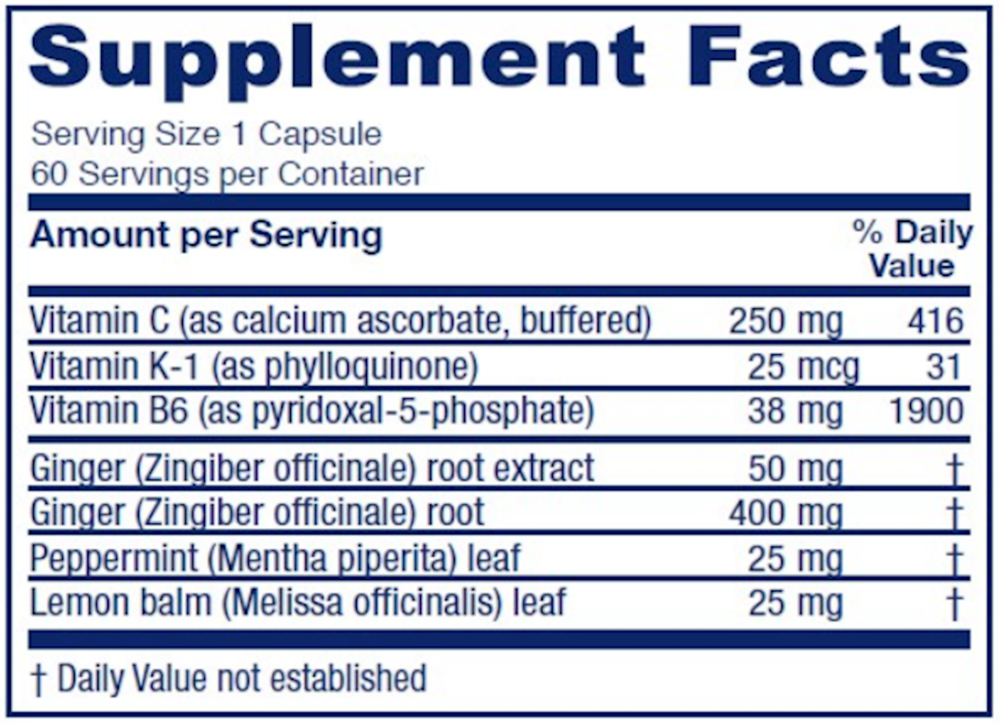 Supports the relief of occasional and pregnancy-related nausea with science based nutrients and historically used herbs.*