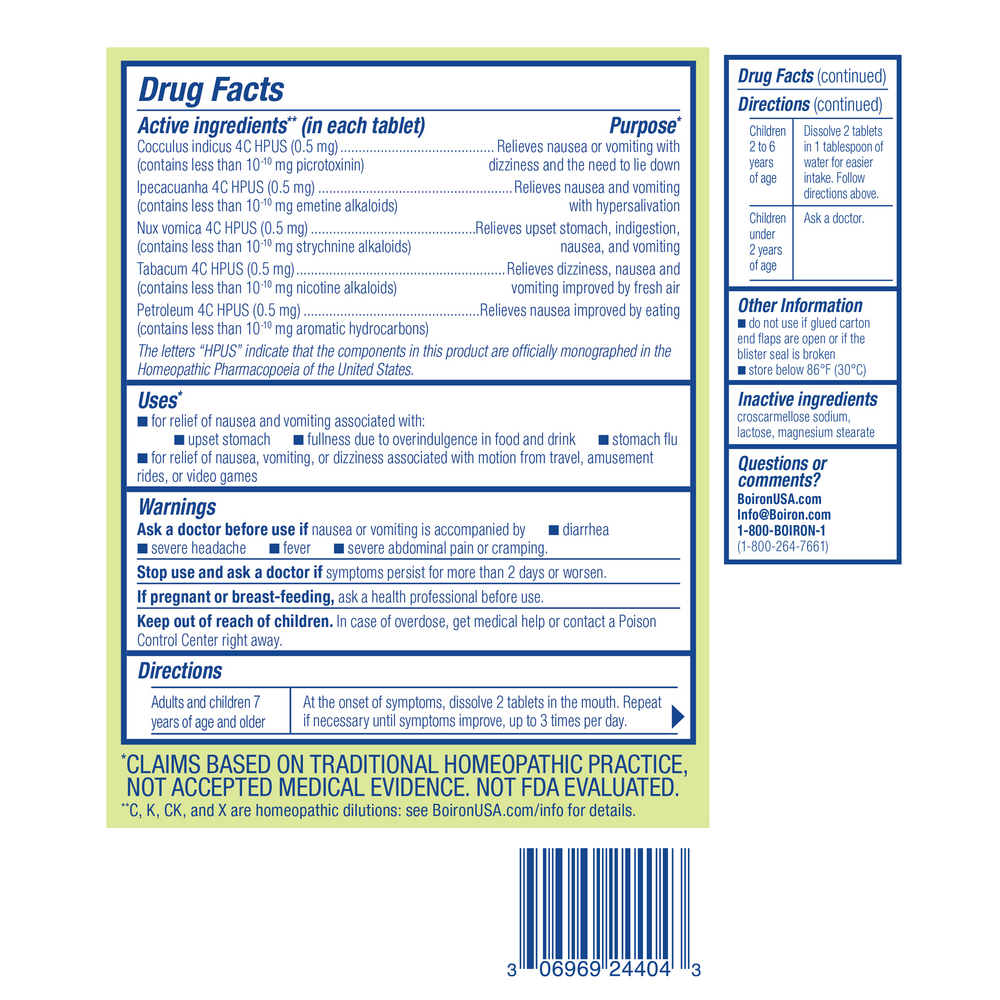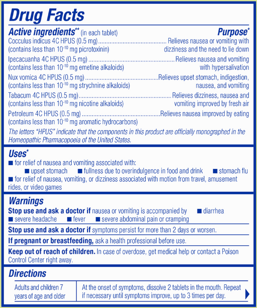 There's a better way to soothe an upset stomach. NauseaCalm by Boiron relieves nausea and vomiting from everyday causes, including stomach flu, using plant-based and other pure active ingredients.* It also works for motion sickness nausea.* Convenient and easy for the whole family to take, the meltaway tablets dissolve in the mouth without food or water for relief anywhere, anytime.As a homeopathic medicine, NauseaCalm works gently on the body without risk of drowsiness or interaction with other medications, herbs, or supplements. And it doesn’t contain ingredients like caffeine, antihistamines, aspirin, or other NSAIDs that could further upset the stomach. NauseaCalm is recommended for adults and children ages 2 and up. For young children, tablets may be dissolved in water for easier intake. Each travel-friendly box contains 60 unflavored meltaway tablets. This medicine is formulated without artificial sweeteners, flavors, colors, or preservatives. Boiron's digestive relief line includes Acidil, Gasalia, Diaralia, and MotionCalm™.*Claims based on traditional homeopathic practice, not accepted medical evidence. Not FDA evaluated.