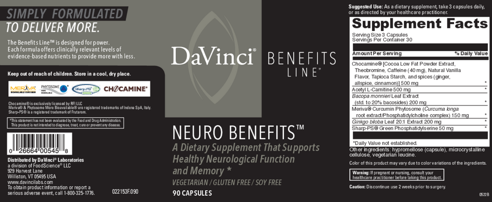Neuro Benefits™ includes both botanical and nutrient ingredients to support healthy neurological function and memory.* The formula provides broad support through various mechanisms of action, including through those of the novel ingredients Chocamine® and Sharp-PS®, which have neurologically centered data to support their importance in a supplement regimen.*