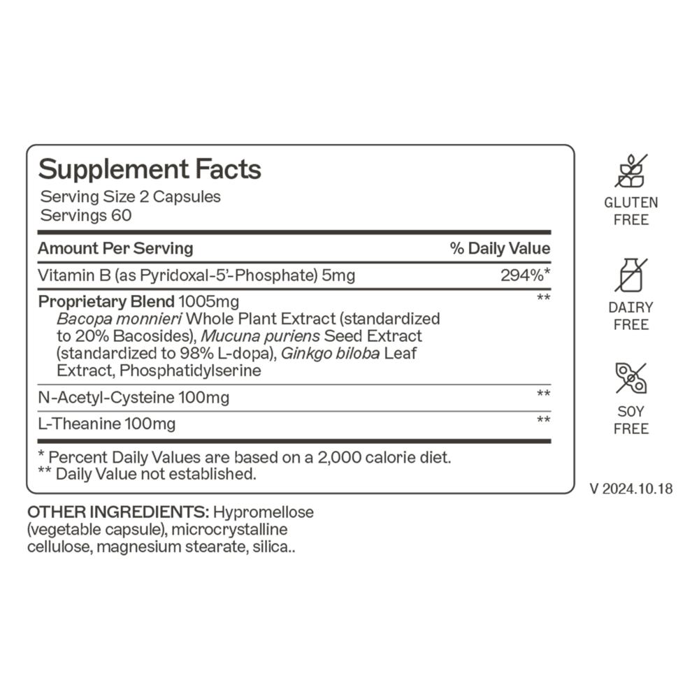 N-Acetyl-Cysteine (NAC) - Acts as a precursor to glutathione, which helps protect the brain from oxidative stress by neutralizing free radicals*