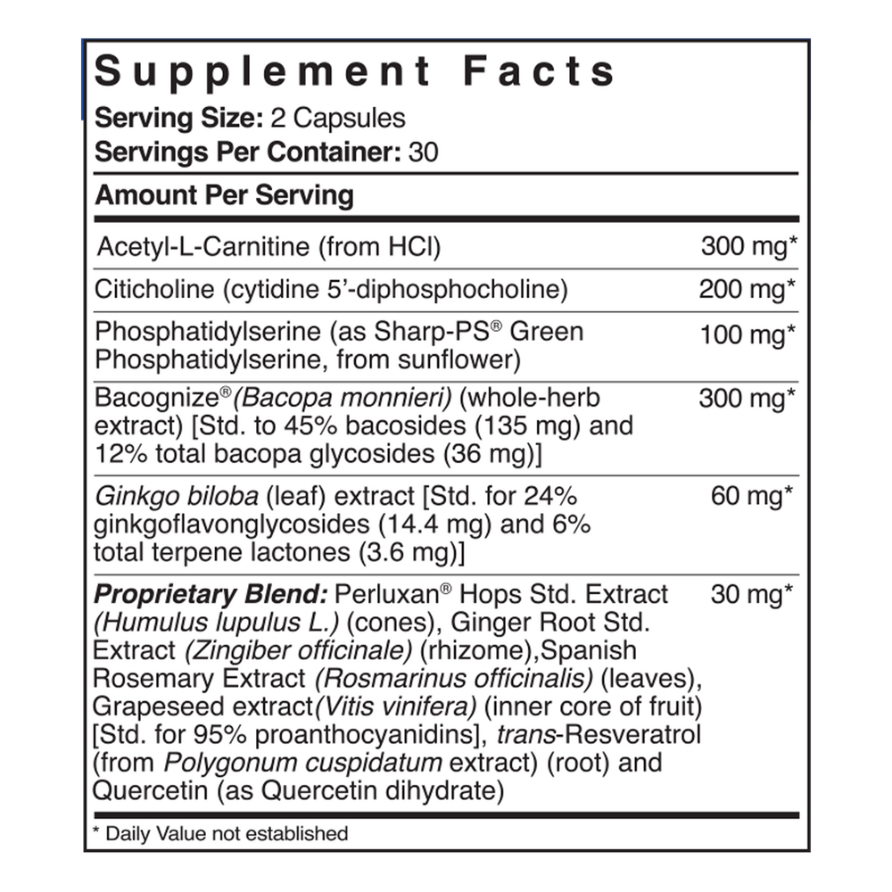 Comprehensive, multi-modal support for cognitive performance, supplying nutrition for neurogenesis, cerebral circulation and antioxidant activity in the brain.