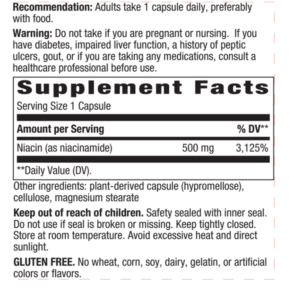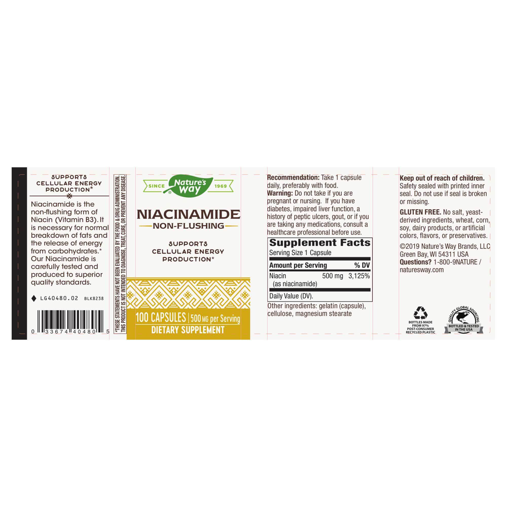 Niacinamide is the non-flushing form of Niacin (Vitamin B3). It is necessary for the normal breakdown of fats and the release of energy from carbohydrates.*