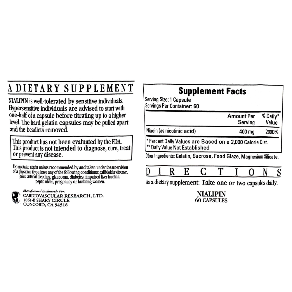 Nialipin 400mg Time Release by Ecological Formulas is a dietary supplement designed to help facilitate the proper functioning of fats and sugars in the body in order to maintain healthy cells and maintain healthy cholesterol levels already in the normal range.* Nialipin 400mg Time Release by Ecological Formulas provides the body with beneficial niacin and niacinamide, both of which are forms of vitamin B3. The time release nature of these capsules help to prevent unwanted flushing often associated with niacin.