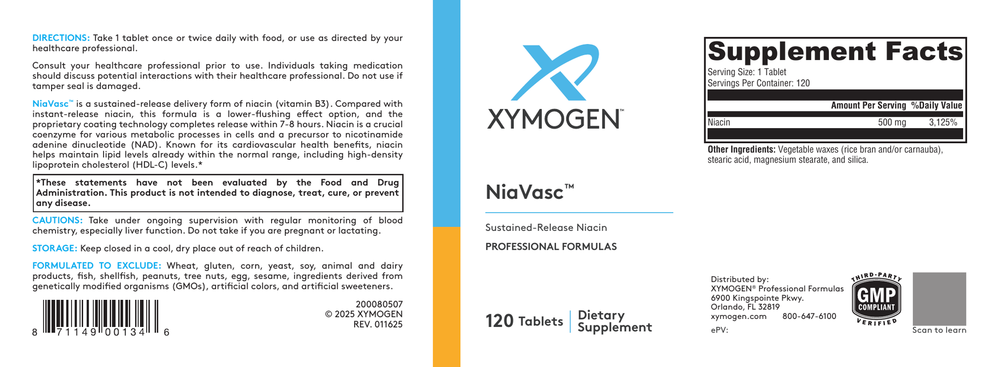 Niacin is one of the most studied and documented nutrients for support of lipid levels already within the normal range, especially high-density lipoprotein cholesterol (HDL-C) levels. Sustained-release niacin, as found in NiaVasc™, has a lesser flushing effect compared with instant-release niacin. Use of a proprietary, wax-coated technology permits release that is complete in seven to eight hours, the time that is considered ideal for a time-release form of niacin.*