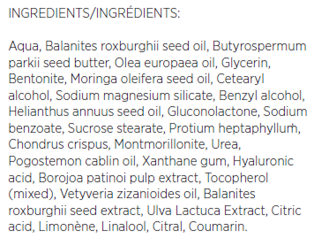 Ingredients: Aqua, Balanites roxburghii seed oil, Butyrospermum parkii seed butter, Olea europaea oil, Glycerin, Bentonite, Moringa oleifera seed oil, Cetearyl alcohol, Sodium magnesium silicate, Benzyl alcohol, Helianthus annuus seed oil, Gluconolactone, Sodium benzoate, Sucrose stearate, Protium heptaphyllum, Chondrus crispus, Montmorillonite, Urea, Pogostemon cablin oil, Xanthane gum, Hyaluronic acid, Borojoa patinoi pulp extract, Tocopherol (mixed), Vetyveria zizanioides oil, Balanites roxburghii seed extract, Ulva Lactuca Extract, Citric acid, Limonne, Linalool, Citral, Coumarin.