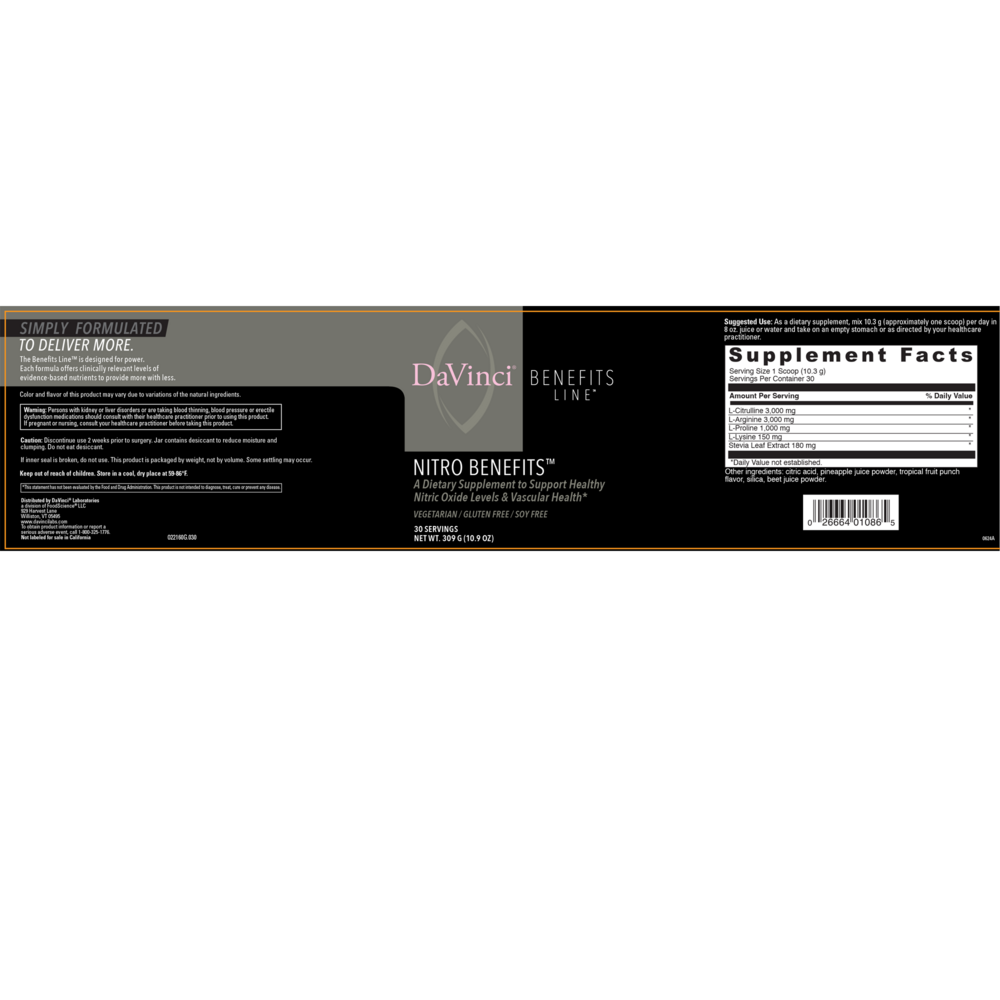 Nitro Benefits represents the gold standard in Nitric Oxide (NO) nutritional support. It contains targeted, precision ingredients aimed at blood vessel support. Citrulline and Arginine both play a role in Nitric Oxide production itself, and Proline and Lysine both lend direct support to the integrity of the blood vessel wall.*