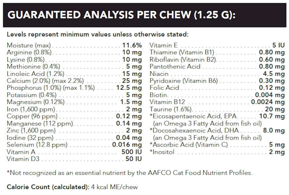 Feeding Directions for Adult Cat: Give one chew daily.