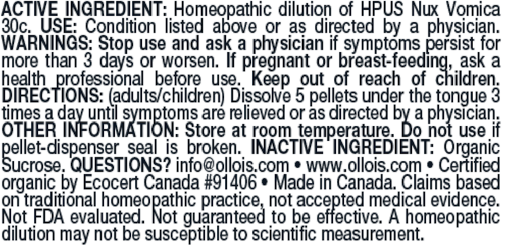 Homeopathic. Ollois organic certified and lactose free Nux Vomica 30C is traditionally used for: indigestion and nausea associated with overindulgence.†