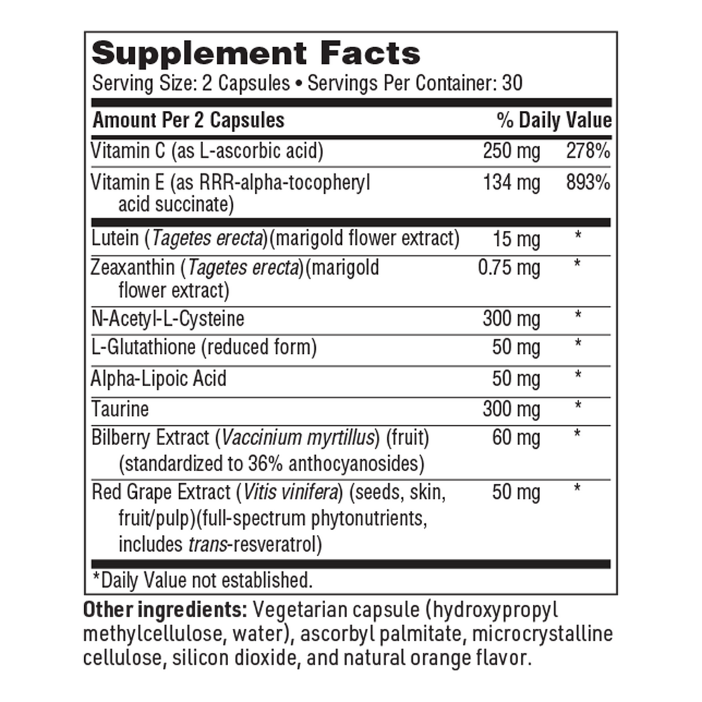 Visual tissues are highly susceptible to free radicals as a result of daily exposure to light radiation and oxygen. Maintaining a strong antioxidant defense system to protect the ocular lens, retina, and macula is critical to maintaining visual health and function. OcuThera™ augments the actions of MultiThera™ multivitamin formulas with key amino acids, antioxidants, and phytonutrients that protect and nourish ocular tissues.† Significant amounts of lutein, taurine, N-acetyl-L-cysteine, and other key nutrients for the eyes are provided in just two daily capsules of OcuThera™ at an affordable price. Extra vitamin E and C are also included, since high levels appear necessary for protecting lens proteins from oxidation.†
