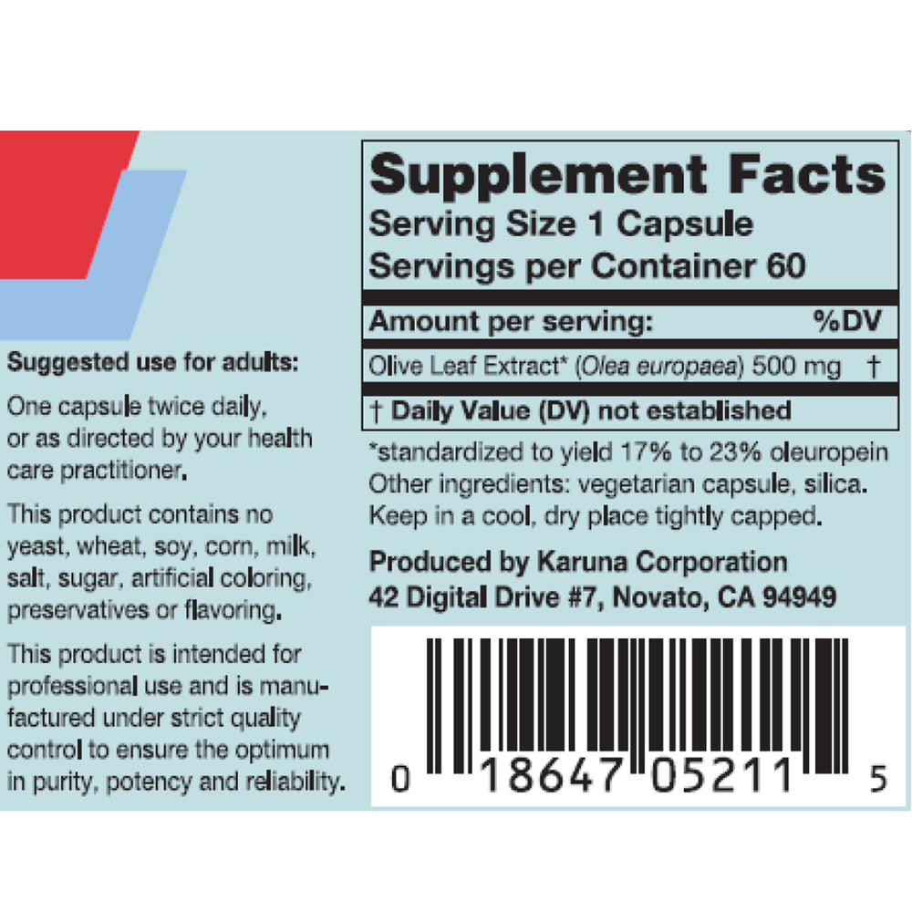 The leaf of the olive tree has been known by traditional herbalists since biblical times. Modern research shows olive leaf contains unique flavonoids including oleuropein, which has several valuable properties for supporting cardiovascular tissues and maintaining normal glucose tolerance, and helping inhibit aspects of microbial metabolism.* Karuna's Olive Leaf Extract is standardized for a high 17% to 23% oleuropein content.