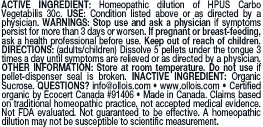 Homeopathic. Ollois organic certified and lactose free Carbo Vegetabilis 30C is traditionally used for: gas pain associated with bloated stomach and fatigue.†