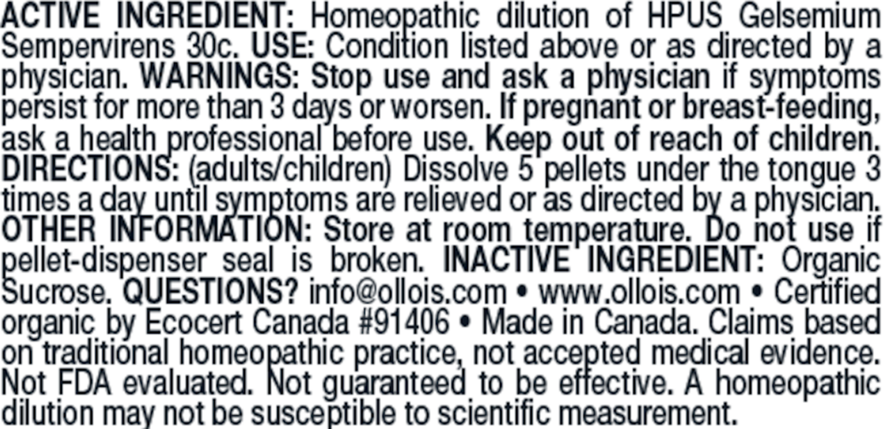 Homeopathic. Ollois organic certified and lactose free Gelsemium Sempervirens 30C is traditionally used for: apprehension, headache, and body ache and fatigue associated with flu.†
