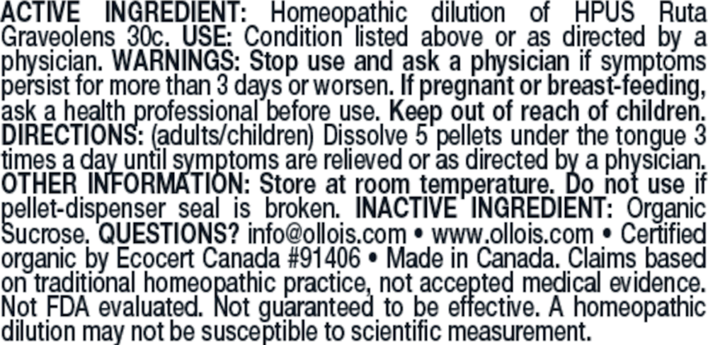 Homeopathic. Ollois organic certified and lactose free Ruta Graveolens 30C is traditionally used for: sprains, tendonitis, and strains.†