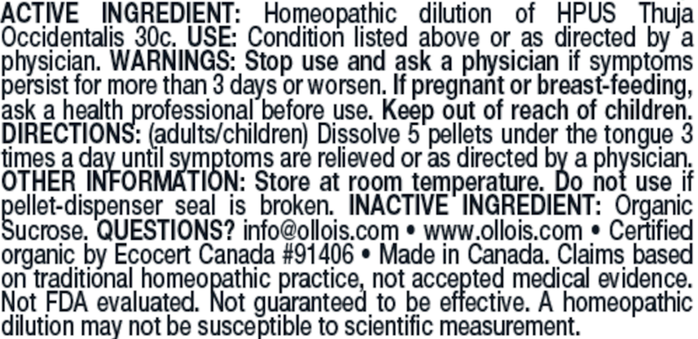 Homeopathic. Ollois organic certified and lactose free Thuja Occidentalis 30C is traditionally used for: warts.†