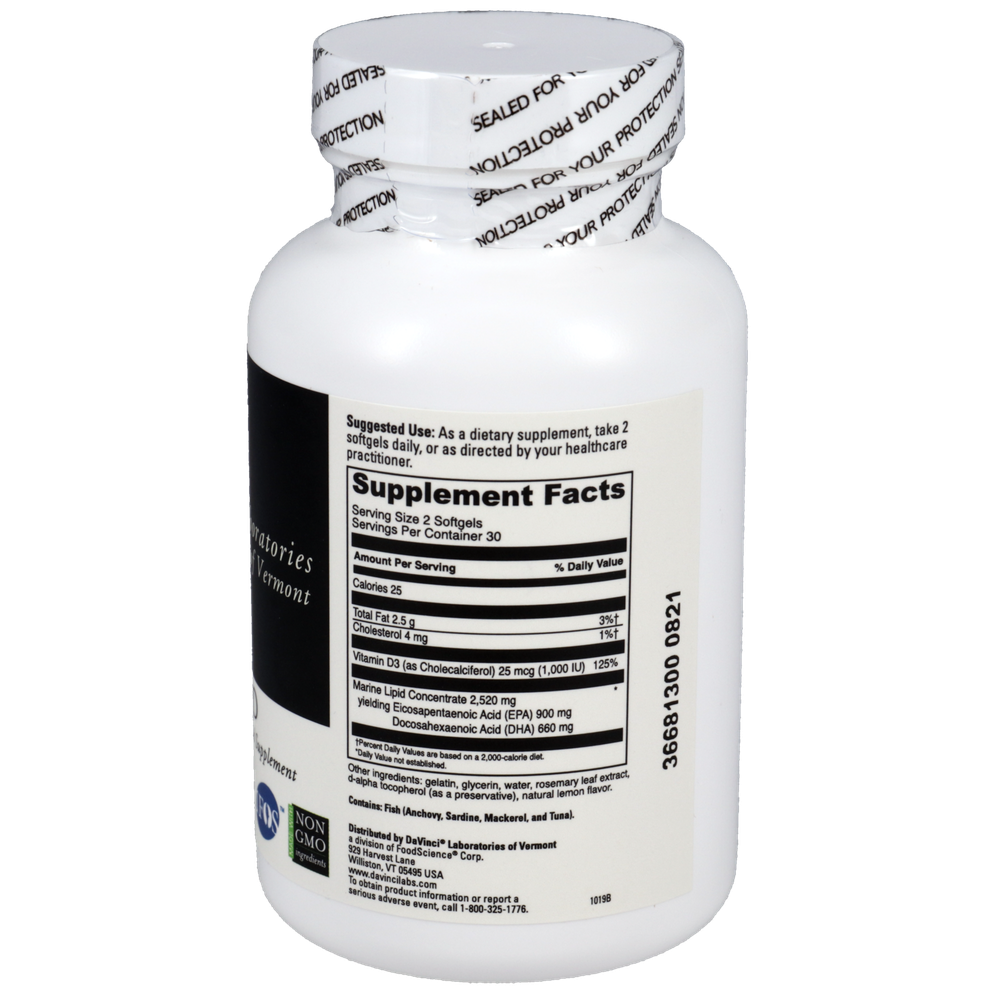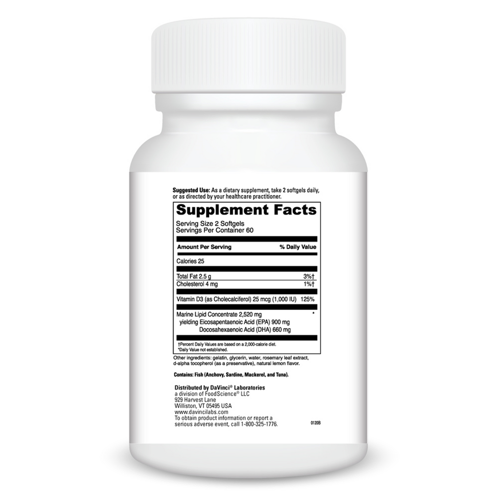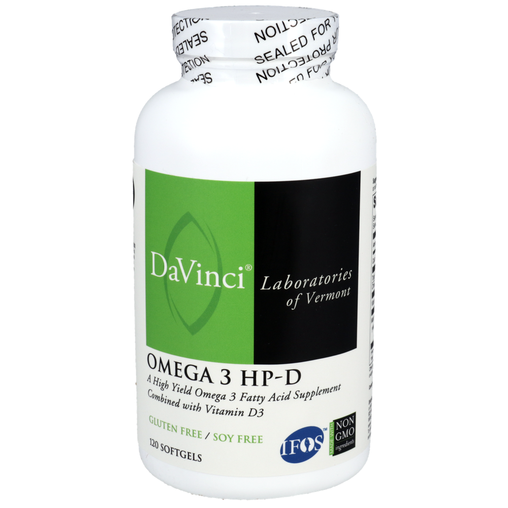 Omega 3 HP-D is our superior quality, lemon flavored Omega-3 formula providing a high yield of EPA and DHA combined with 1,000 IU of Vitamin D3. The Omega-3 fish oil, in this product, is from wild caught anchovies. The oil is then molecularly distilled to ensure purity and stability. This formula meets the strictest criteria to be sure that only minimal trace concentrates of heavy metals and other contaminants are below industry standards. Omega 3 HP-D supports healthy cholesterol balance, cardiovascular, joint and skin health, as well as immune system function.*