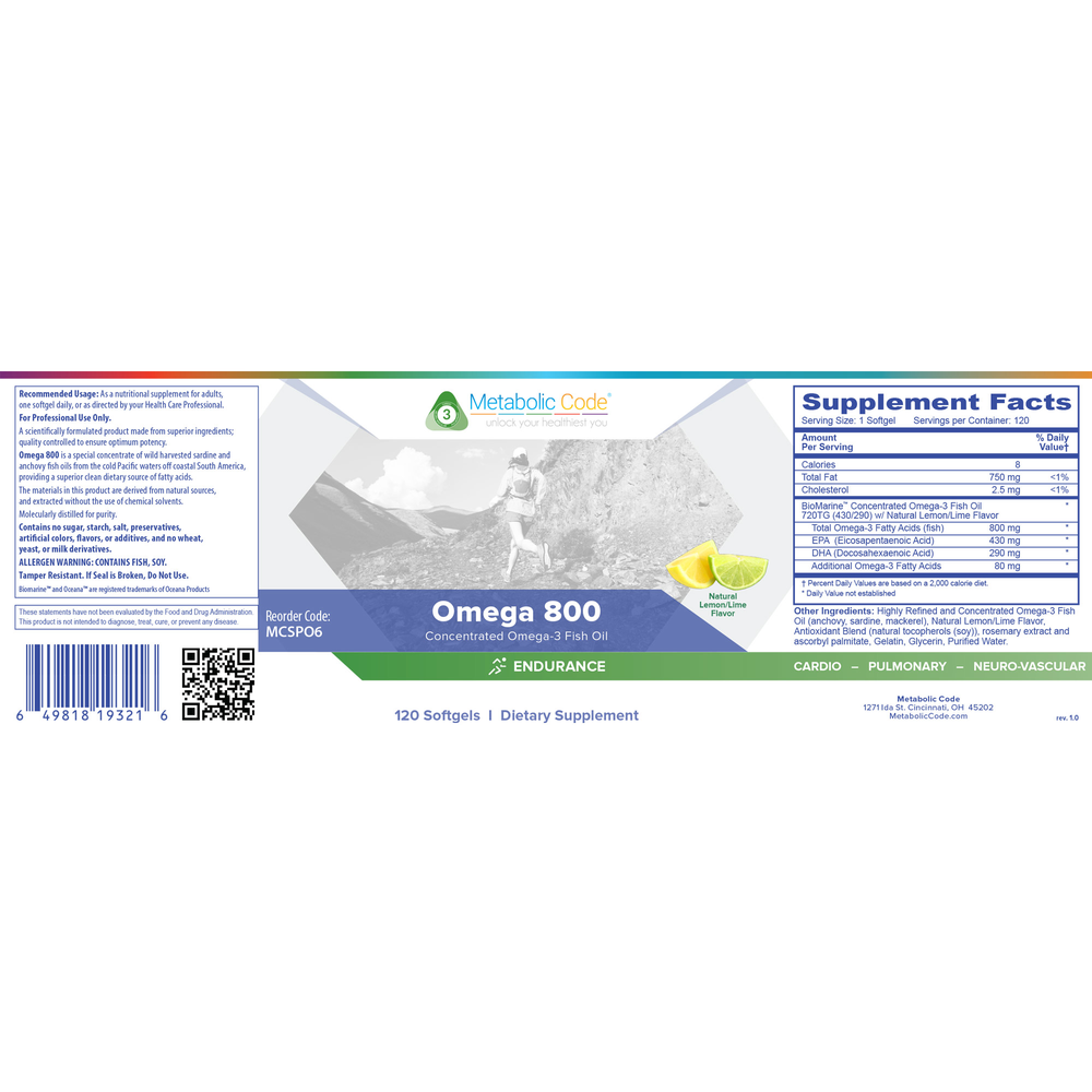 Omega 800 is a  concentrated, purified source of pharmaceutical-grade omega-3 fatty acids from wild and sustailably harvested sardine and anchovy fish oils from the cold Pacific waters off coastal S . America.   Omega 800 is  from natural sources, extracted without the use of chemical solvents, then molecuarly distilled for optiaml purity and stabilized with natural antioxidants. Omega-800 is flavored with natural lemon/lime. Each capsule provides 430mg EPA and 290mg DHA. Omega 800 is a TRIAD 2 Immune/ Brain and TRIAD 3 cardiovascular supportive supplement.