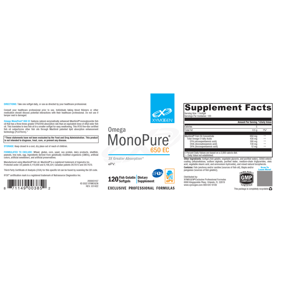 Omega MonoPure® 650 EC features natural enzymatically enhanced MaxSimil® monoglyceride fish oil that has a three times greater EPA/DHA absorption rate than an equivalent dose of ethyl ester fish oil. This translates to less fish oil in a smaller softgel for easy swallowing. This IFOS five-star certified fish oil outperforms other fish oils through MaxSimil patented lipid absorption enhancement technology (PLATform).*