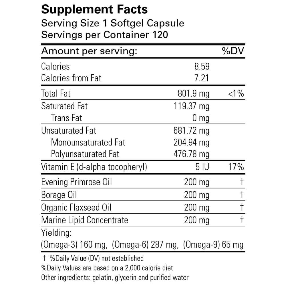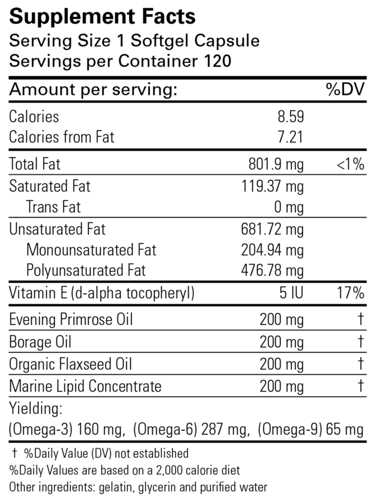 OmegaPlex is a broad-spectrum essential fatty acid supplement, providing special fatty acids from both the omega-3 (EPA/DHA) and omega-6 (GLA) families in easy-to-swallow capsules. In addition to the separate benefits of flax, borage, and fish oils, combinations of these have been shown to favorably benefit the immune system and bone density; future research promises to explore additional synergistic effects. Given the evidence that Americans seldom obtain sufficient amounts of these essential fatty acids, OmegaPlex is a valuable adjunct to many supportive nutrition interventions.*