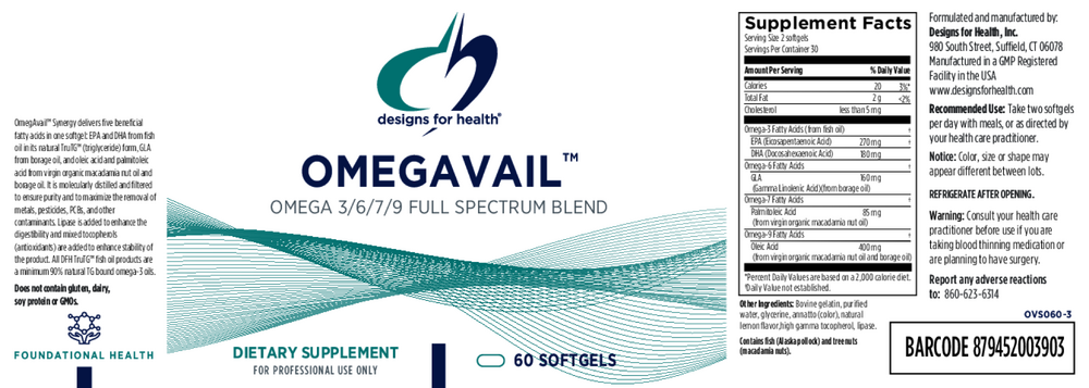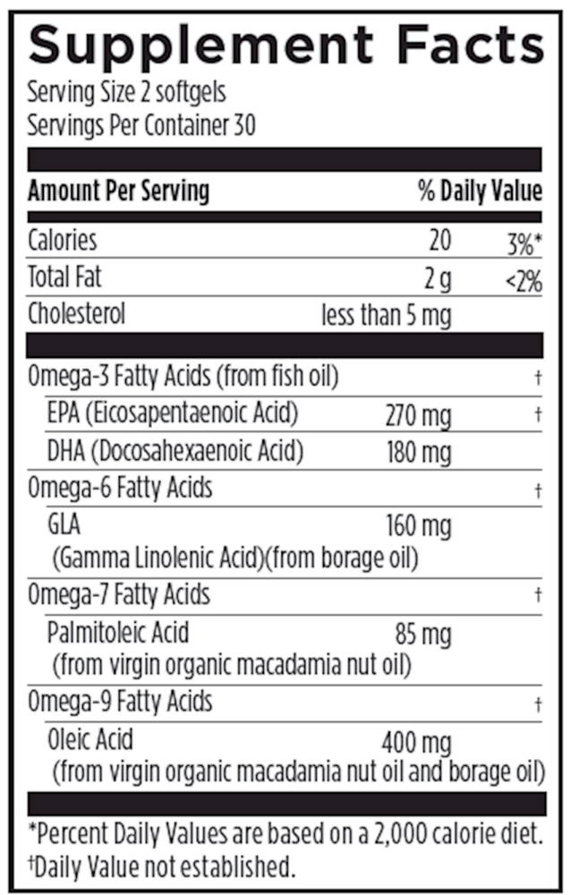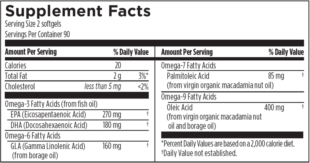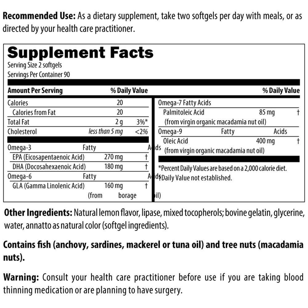 OmegAvail™ Synergy’s unique omega 3-6-7-9 formula contains a blend of omega-3 fats (EPA/DHA) in the TruTG™ form, the omega-6 GLA (from borage oil), the omega-7 fat palmitoleic acid and omega-9 fat oleic acid from certified virgin organic macadamia nut oil.