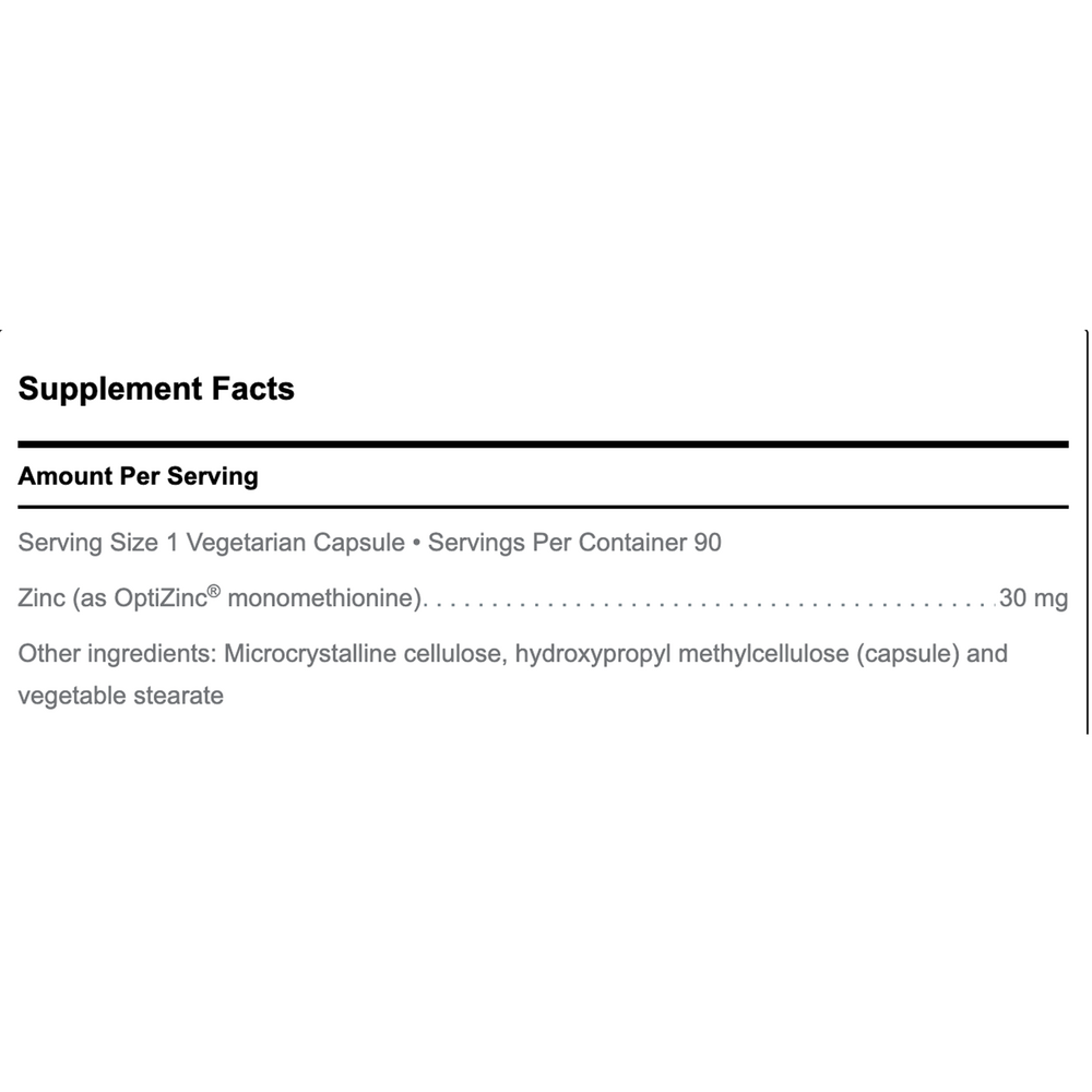 Opti-Zinc™ 30 vegetarian capsules supply elemental zinc monomethionine, a chemically defined, patented organic compound which provides zinc and the amino acid methionine.