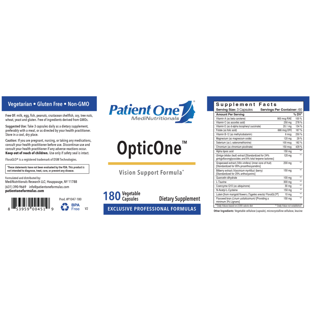 Patient One OpticOne™ supplies a comprehensive blend of over 15 synergistic nutrients known to protect and support healthy optic nerve function. OpticOne was formulated to help regulate ocular fluid and blood flow and promote reduced intraocular pressure (IOP). Created in conjunction with ophthalmologists, this research-based formula allows for increased intake of targeted ocular antioxidants that promote a healthy retina, lens and optimal eyesight function.