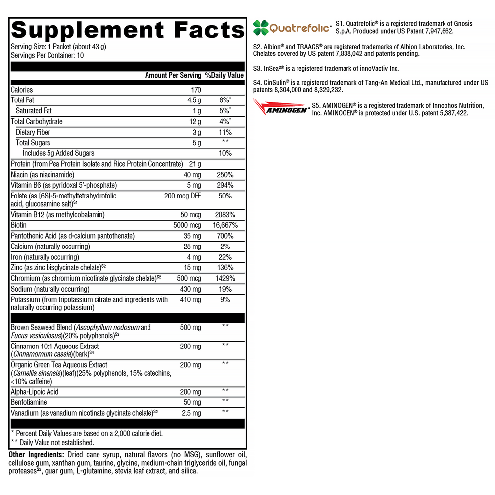 OptiMetaboliX also delivers other innovative ingredients, including VegaPro™—a proprietary sugar-free, sweetener-free, low-allergy-potential source of vegetable protein from pea protein and rice protein—and CinSulin®, a patented water extract of cinnamon with a potent 10:1 yield ratio. Cinnamon has been studied extensively for its roles in supporting healthy glucose uptake, glycogen synthesis, and insulin action, along with maintaining blood lipids already within the normal range. These principal ingredients are complemented by the inclusion of benfotiamine to boost transketolase activity; alpha-lipoic acid; green tea leaf extract; vanadium, chromium, and zinc as Albion® TRAACS® chelates; 5-MTHF (bioactive folate) as Quatrefolic®; fiber from inulin; and other key vitamins and minerals.*
