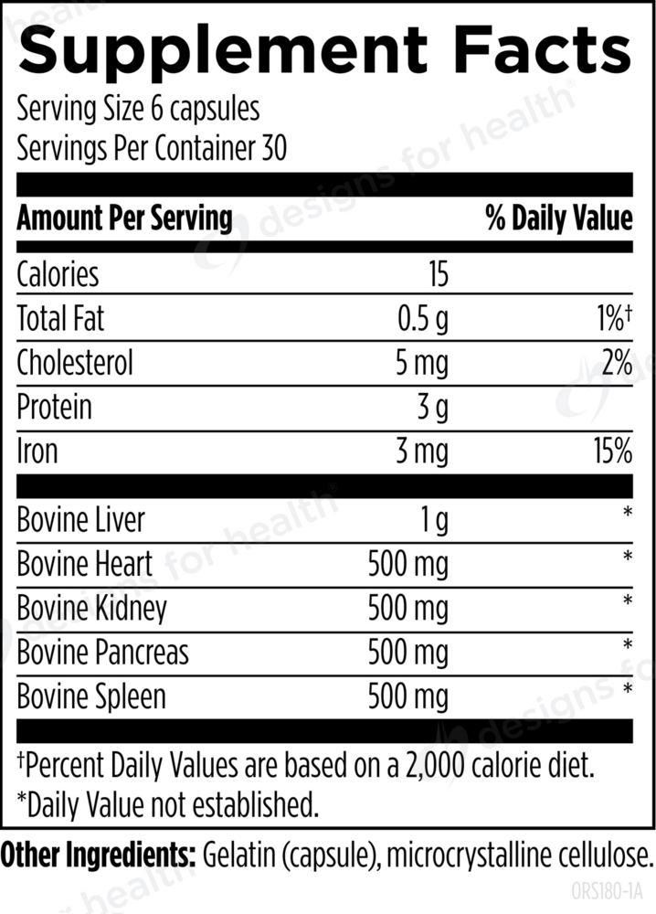 Organ Synergy™ is a unique combination of freeze-dried bovine organs sourced from 100% grass-fed and finished New Zealand cattle (free from bovine spongiform encephalopathy). This product is formulated with a targeted blend of five different bovine organs, including the liver, heart, pancreas, kidney, and spleen, which may help support nutrient status in the body.* Each 6-capsule serving provides 1 g of bovine liver and 500 mg each of bovine heart, kidney, pancreas, and spleen (produced from 0.6 oz. raw organ weight) in a convenient capsule delivery. Organ Synergy™ is a good source of iron, providing 3 mg (15% DV) per serving, and it also contains 3 g of protein per serving.