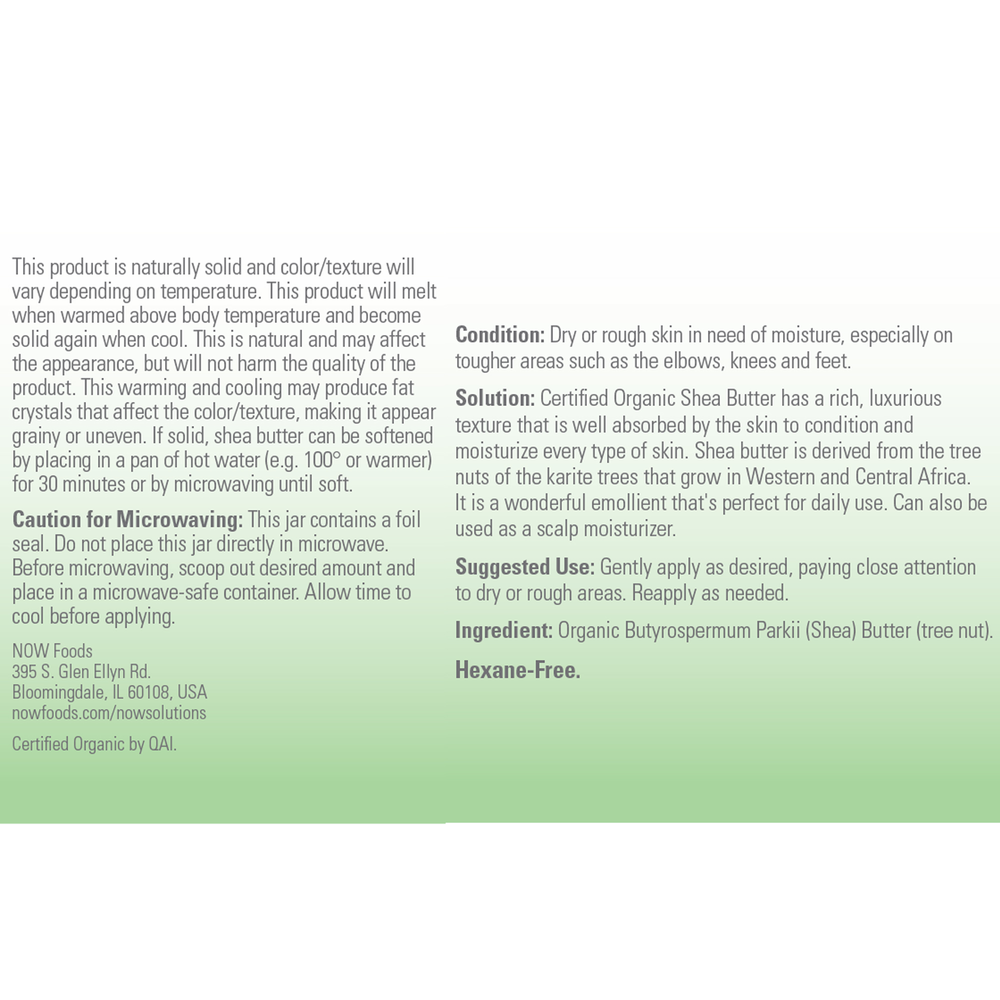 Solution: Certified Organic Shea Butter has a rich, luxurious texture that is well absorbed by the skin to condition and moisturize every type of skin. Shea butter is derived from the tree nuts of the karite trees that grow in Western and Central Africa. It is a wonderful emollient that's perfect for daily use. Can also be used as a scalp moisturizer.