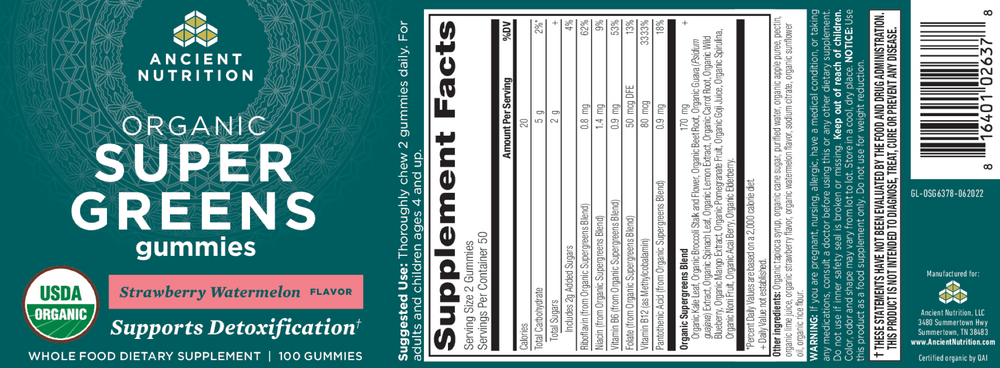 Organic greens in a deliciously sweet gummy. Organic SuperGreens Gummies are packed with 15 powerful superfoods – like spirulina, acai berry, elderberry and more – to help your body cleanse and detox. Created to bring you the benefits of juicing (without the mess!), Organic SuperGreens Gummies are an easy, convenient way to get the superfoods you don’t normally get through diet alone.