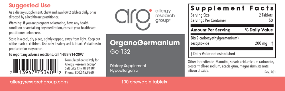 Allergy Research Group® introduced pure germanium into the United States in 1986. They recognize the importance of providing pure and tested Ge-132. To assure the quality and purity of our germanium products, they carefully analyze every lot. Testing procedures include identification by infrared spectroscopy, purity by acid group titration, and absence of inorganic germanium impurities by color limit test.*
