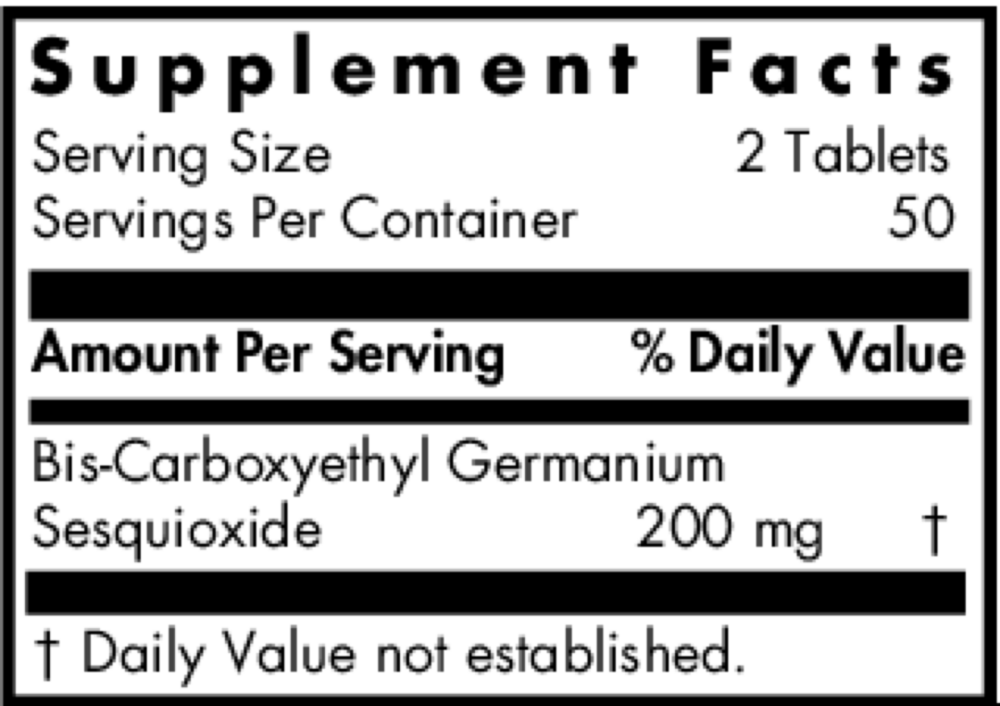 This is the same Orango-Germanium except in tablet form. Pure Ge-132 Germanium is a unique organogermanium compound, bis-carboxyethyl germanium sesquioxide, sometimes called just germanium sesquioxide. It has unique molecular characteristics which make it virtually unreactive in the body, and its small particle size and unique structure permit it to be readily cleared in the urine as the intact molecule.