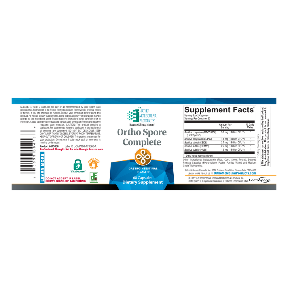 Ortho Spore Complete is a unique spore-based, broad-spectrum probiotic formula designed to promote a healthy gut microbiota, support gastrointestinal (GI) health, and support immune function.* Ortho Spore Complete is specifically formulated with several spore-based probiotic strains to promote diversity and balance within the host gut microbiota.* Each capsule provides key Bacillus strains that remian in a dormant, protective state in the harsh GI environment, then become active on target to transiently re-establish and recondition the gut to help prevent small intestinal bacterial overgrowth (SIBO) replaps.*