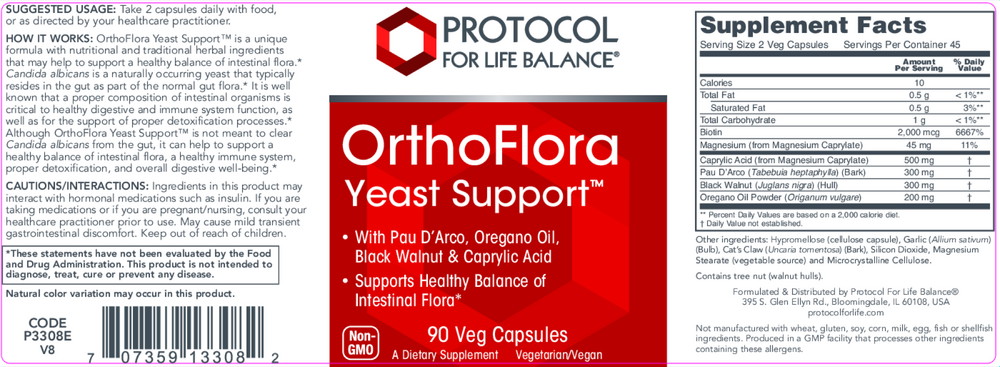 OrthoFlora Yeast Support™ is a unique formula with nutritional and traditional herbal ingredients that may help to support a healthy balance of intestinal flora.* Candida albicans is a naturally occurring yeast that typically resides in the gut as part of the normal gut flora.* It is well known that a proper composition of intestinal organisms is critical to healthy digestive and immune system function, as well as for the support of proper detoxification processes.* Although OrthoFlora Yeast Support™ is not meant to clear Candida albicans from the gut, it can help to support a healthy balance of intestinal flora, a healthy immune system, proper detoxification, and overall digestive well-being.*