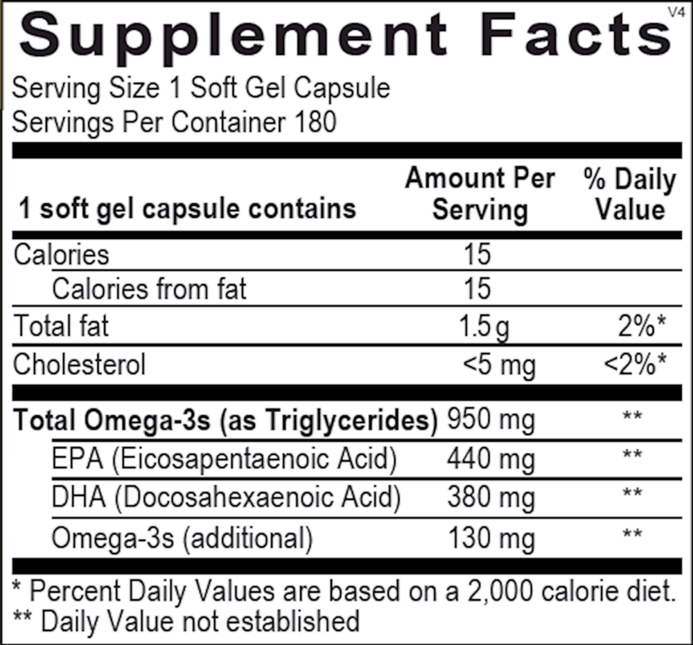 Orthomega® provides 820 mg of eicosapentaenoic acid (EPA) and docosahexaenoic acid (DHA) per soft gel as natural triglycerides, the preferred form with superior absorption. Vitamin E (as mixed tocopherols) and rosemary extract are used to ensure maximum purity and freshness.