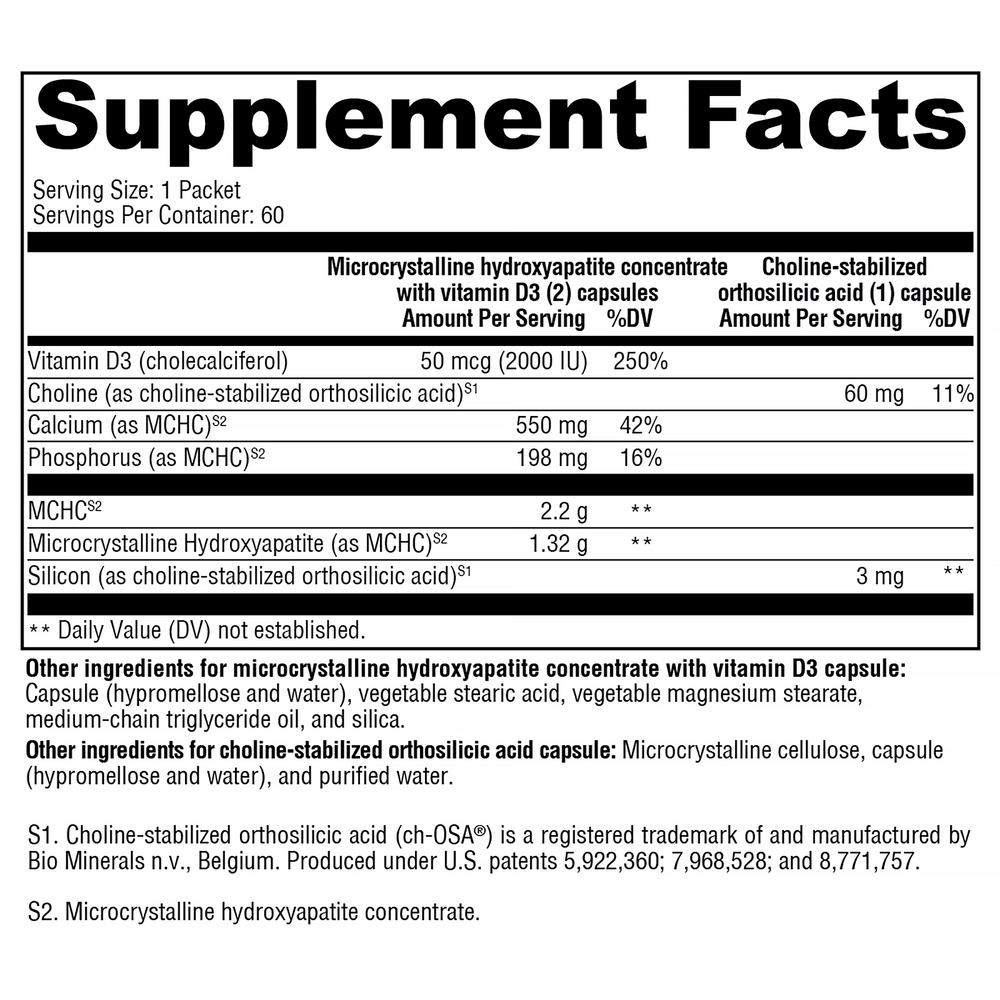 OSAplex™ is a comprehensive, convenient, and cost-effective dietary supplement that supports healthy bones, cartilage, and ligaments. Each packet provides the following: two capsules containing a combination of microcrystalline hydroxyapatite concentrate (MCHC) and vitamin D3, along with one capsule of choline-stabilized orthosilicic acid (ch-OSA®).*