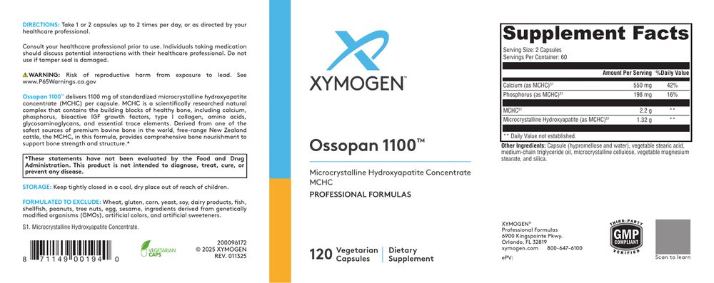 Ossopan is a well-researched, standardized extract from one of the world’s safest premium sources of bone—free-range New Zealand cattle. Ossopan contains microcrystalline hydroxyapatite concentrate (MCHC), a complex crystalline compound composed primarily of calcium, phosphorus, bioactive growth factors, type I collagen, amino acids, glycosaminoglycans, and a broad range of essential trace elements that naturally comprise healthy bone. Ossopan 1100™ provides 1100 mg of MCHC per capsule to optimally support bone strength and structure.*