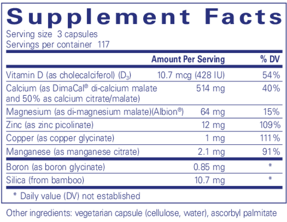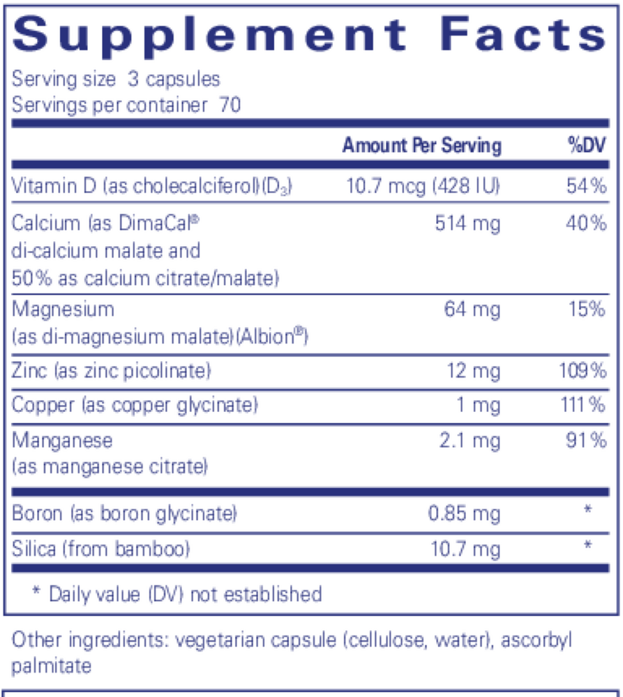 One study indicated that concomitant supplementation of the trace minerals zinc, copper, and manganese with calcium citrate/malate helped to promote healthy bone metabolism in postmenopausal subjects. Magnesium supports healthy bone mineral density and boron plays an important role in reducing urinary calcium and magnesium excretion. Like boron, vitamin D3 reduces urinary calcium loss but is also a key nutrient because it enhances calcium absorption.*