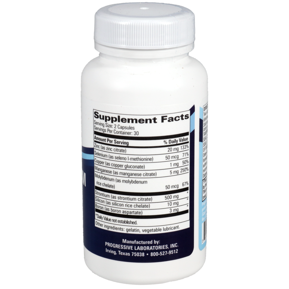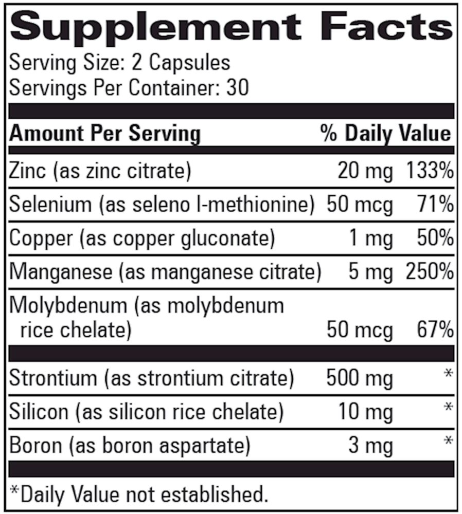 The Osteo-Mins™ AM formula containing strontium, zinc, selenium, copper, manganese, molybdenum, boron and silicon, is taken in the morning. The Osteo-Mins™ PM formula containing calcium, magnesium, vitamin D (or vitamins D and K) are taken at bedtime.