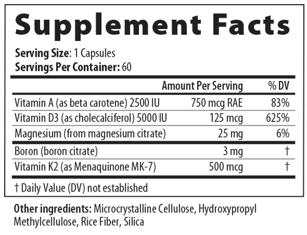 • Provides balanced vitamin A, D3 and K2 doses for optimal calcium metabolism*