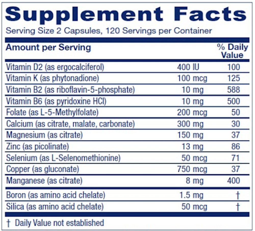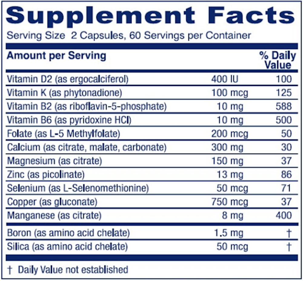 • Important trace minerals and vitamins: Manganese, Boron, Zinc, Copper, and Vitamin B6 and Methylated Folate (as L-5-MTHF)