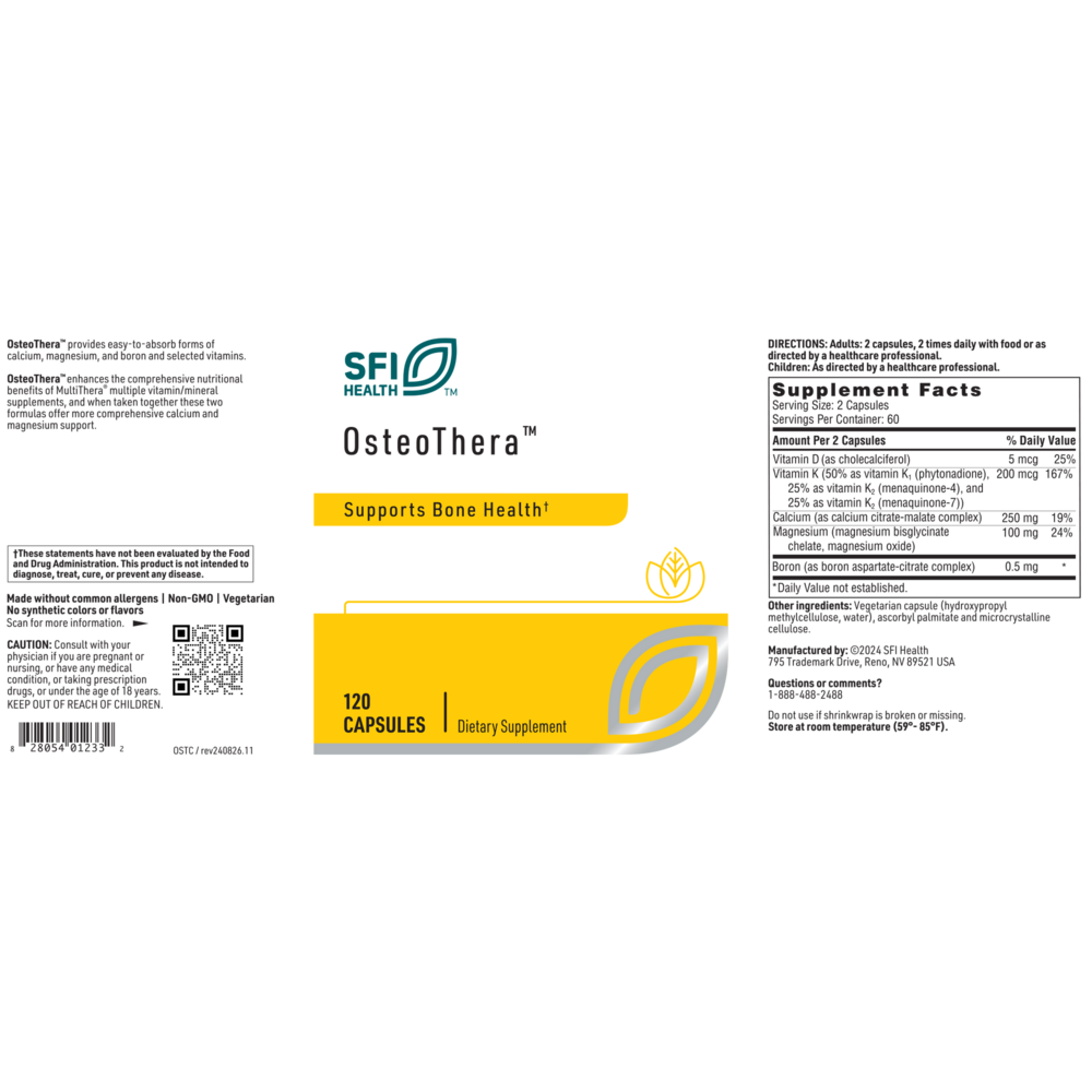 OsteoThera‚Ñ¢ provides highly bioavailable forms of minerals essential for bone health, plus synergistic nutrients are included to maximize mineral absorption using the least number of capsules.* Calcium and vitamin D support bone mineral density, magnesium supports bone strength and metabolism, boron promotes calcium and magnesium balance, and vitamin K activates proteins used in bone metabolism.* OsteoThera‚Ñ¢ is a good choice for adult men and women of all ages.