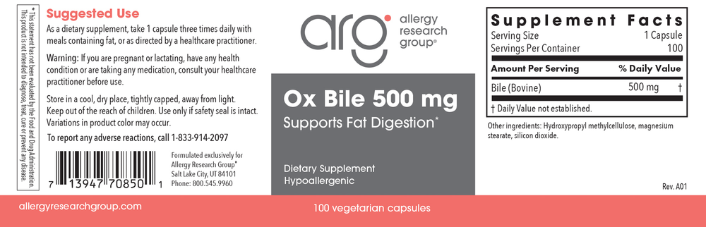 Derived from a bovine source and freeze-dried (lyophilized) to maintain its biological activity. Ox Bile is a suitable supplement to the liver's production of bile.* Also available in quarter dose, Ox Bile 125 mg.