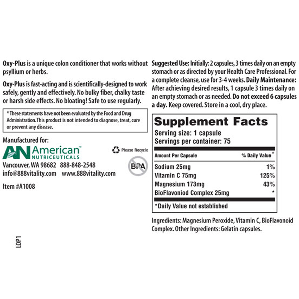 Oxy-Plus is a unique colon conditioner that works without pysilium or herbs. It is fast-acting and is scientifically designed to work safely, gently, and effectively. No bulky fiber, chalky taste, or harsh side effects. It works with oxygen (nature's powerful detoxifier). Oxy Plus colon cleanser filters out debris to revitalize the colon. This product is safe to take on a daily basis without side effects while working as a detoxifier.