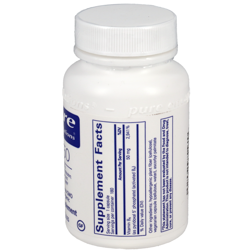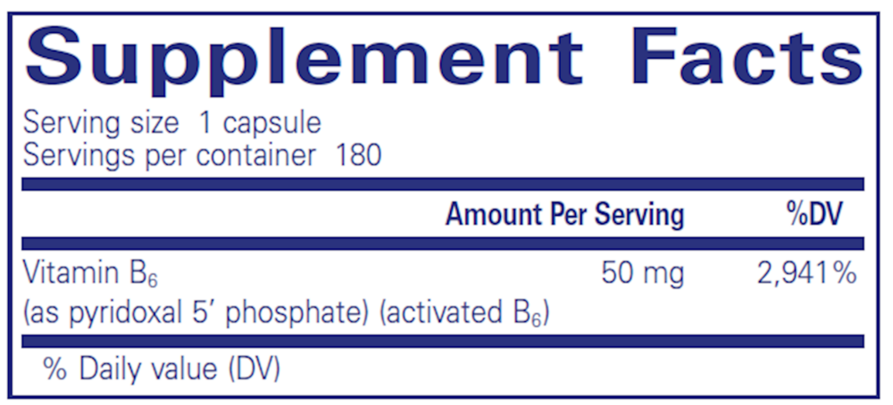 Pyridoxal 5' phosphate (P5P) is the active metabolite of pyridoxine and is the predominant form of plasma B6. P5P is required for proper absorption of B12 and magnesium, and for the production of gastric HCl. It is an important coenzyme in the metabolism of carbohydrates, fats, and proteins, and the elongation of essential fatty acids.