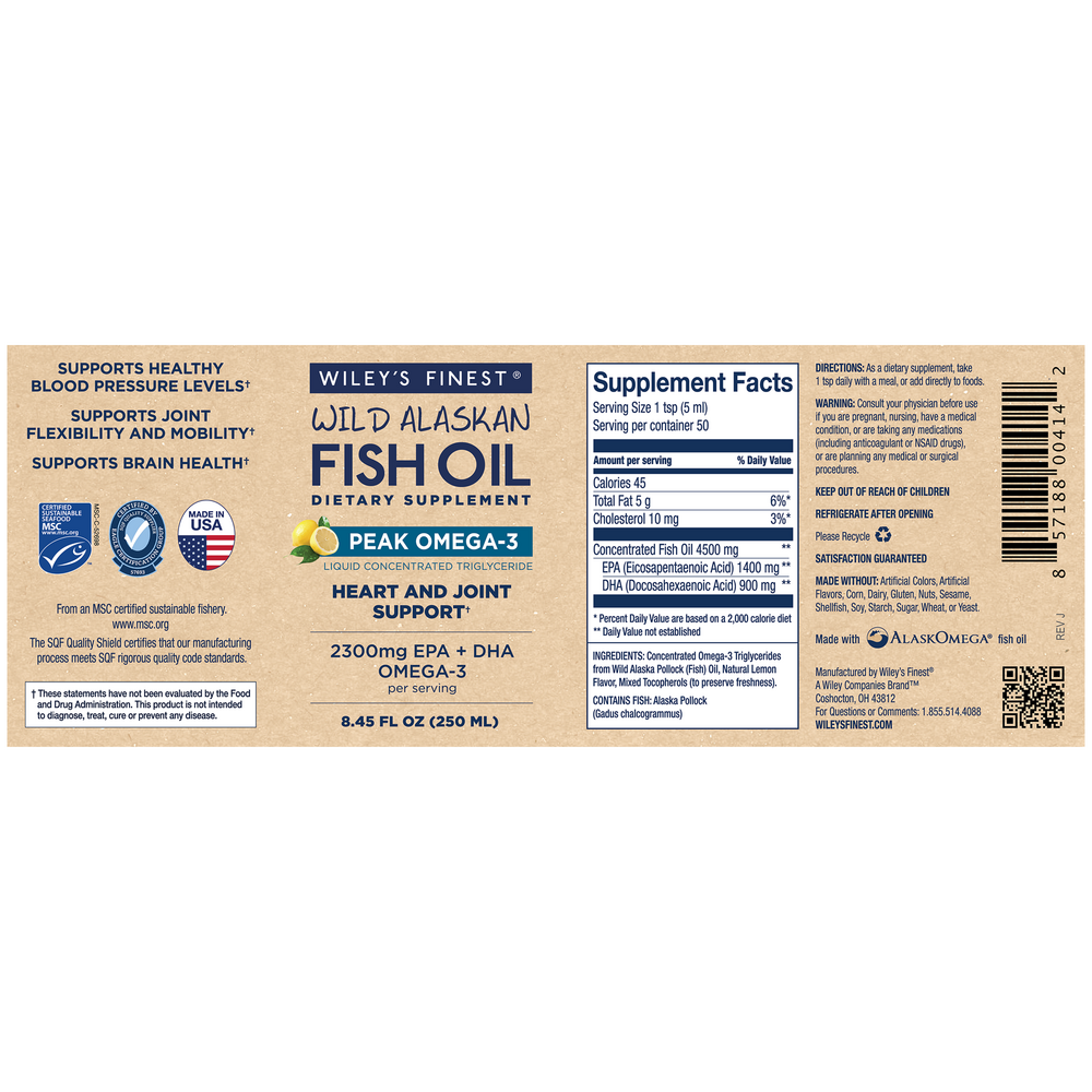 Wiley's Finest great tasting Peak Omega-3 Liquid has natural lemon flavor and is guaranteed 90% Triglyceride form. With 2300mg of EPA+DHA per teaspoon, it provides a concentrated dose of Omega-3 fatty acids in every serving.